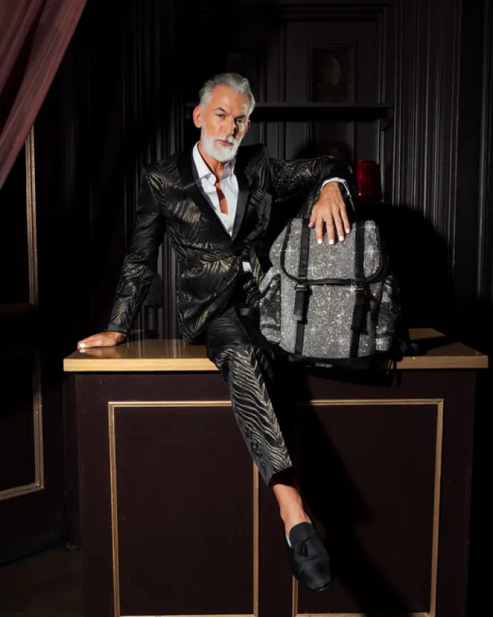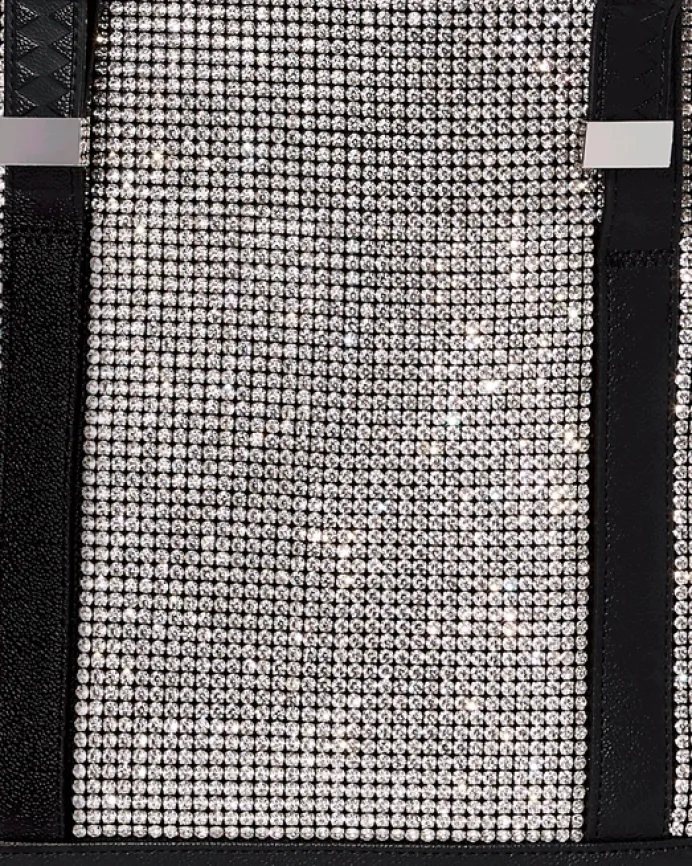 Our classic monte Carlo backpack with side cargo pockets Encrusted with rhinestones Featuring silver hardware and black Trims 100% FAUX LEATHER PRODUCT DETAILS Exterior Dimensions: 18" x 6" x 11.5" • Top Flap opening w/ adjustable metal enamel buckles and drawstring closure • Two side cargo pockets with metal e