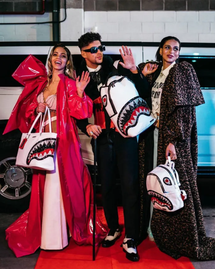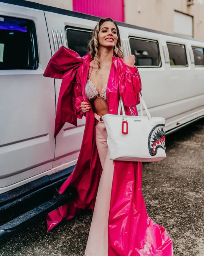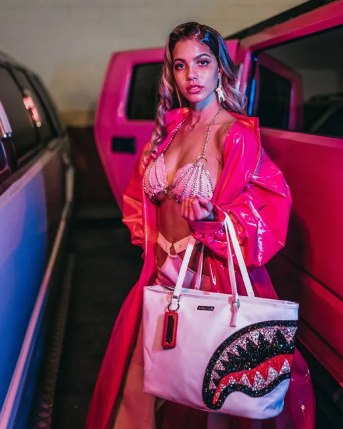 Your over the shoulder bag doesn't have to be boring anymore. Stand out with the printed Sprayground Totes. Includes Sprayground Logo Keychain Mirror. PRODUCT DETAILS Crystal Embellishment Exterior Dimensions: 19" x 6.5" x 11.5" • Top zipper opening • Top double handle • Sprayground keychain • Gold zippers with