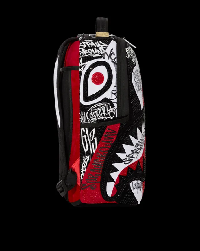 DLXV = 100%FAUX LEATHER CRYSTAL EMBELLISHMENT PRODUCT DETAILS Exterior Dimensions: 18" x 6" x 11.5" • Front zipper pocket • Side pockets • Zippered Stash pocket • Separate velour sunglass compartment • Ergonomic mesh back padding • Adjustable Straps for custom sizing • Gold zippers with metal hardware • Metal
