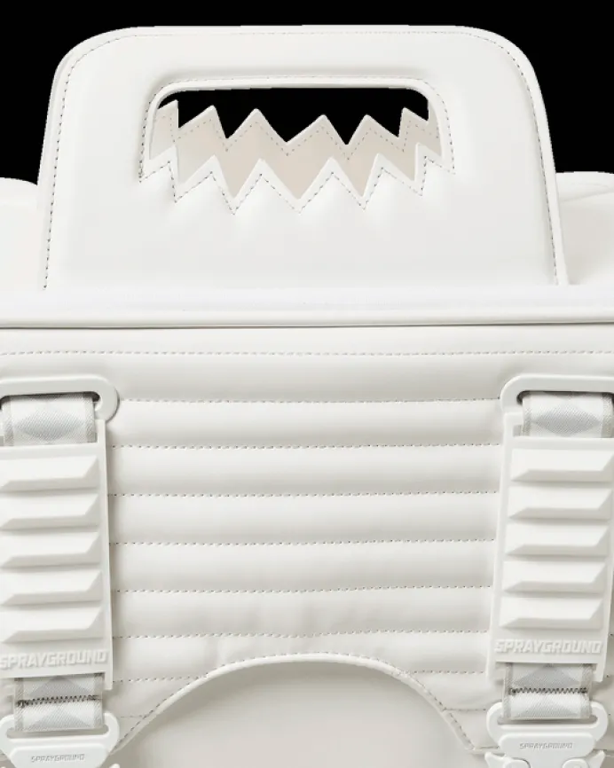 100% PU with horizontal quilting details Textured Rubber bottoms Signature Shark bite handles Cargo Pockets with for extra storage with futuristic rubber details Top handles fold down to fit easily in an overhead compartment EXTERIOR:H: 19.5” x W: 14.5“x D: 7” YKK® Zipper FrameFront Exterior PocketEmbossed Logo