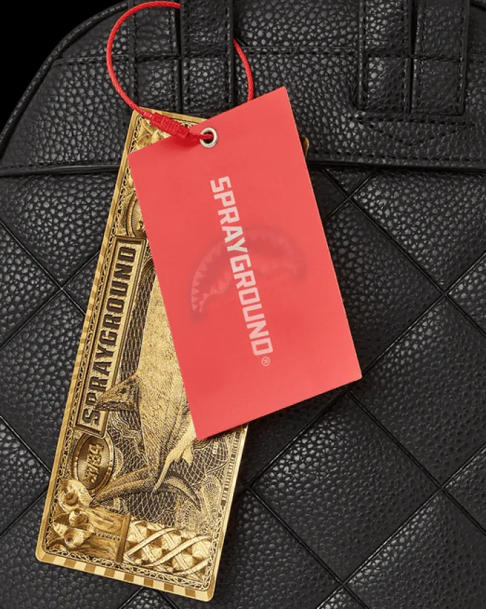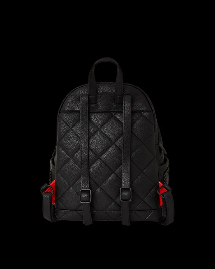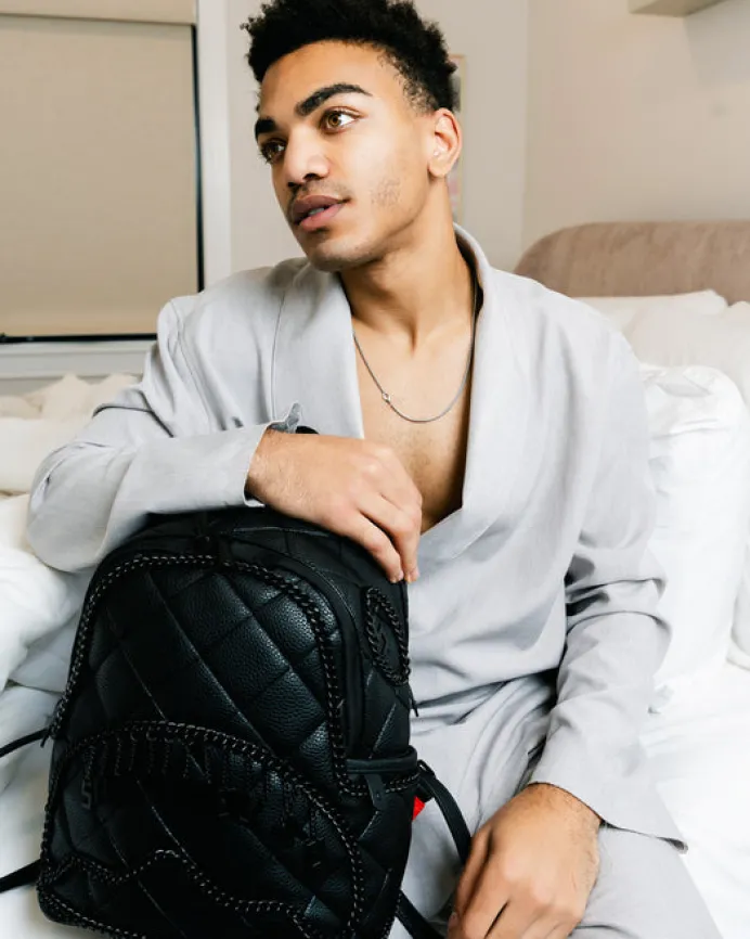 100% PVC quilted black faux leather featuring black chain hardware and hanging charm logo. Exterior Dimensions: 10" x 5" x 11.5" • Two large main zippered compartments • Side pockets • Zippered Stash pocket • Adjustable straps for custom sizing • Gold zippers with metal hardware Interior Zippered organizer pock