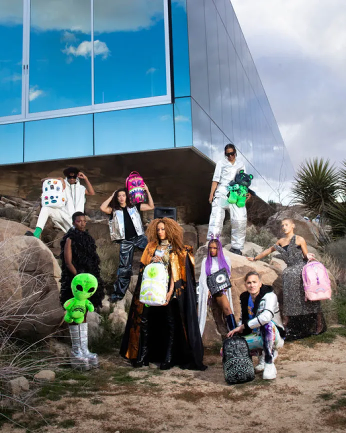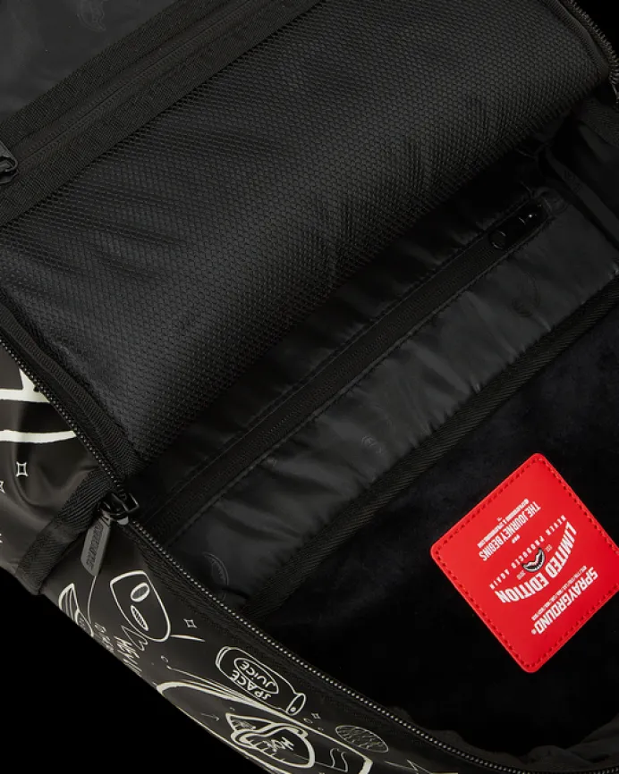 Glow in the dark fabric PRODUCT DETAILS Exterior Dimensions: 18" x 6" x 11.5" • Front zipper pocket • Side pockets • Zippered Stash pocket • Separate velour sunglass compartment • Ergonomic mesh back padding • Adjustable Straps for custom sizing • Gold zippers with metal hardware • Metal "Sprayground Authentic