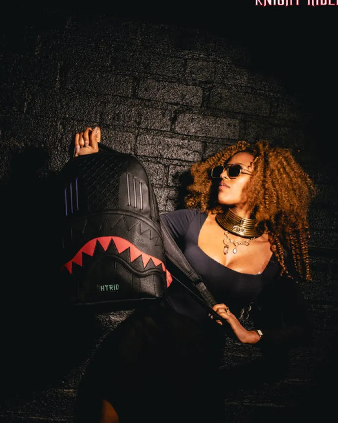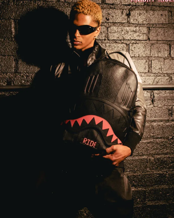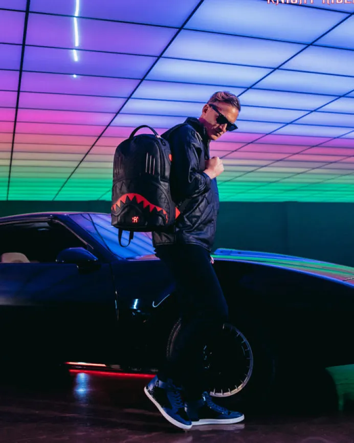 Travel back to the 80’s with the exclusive KITT shark backpack! Light up with interior on/off button with running led display “Knight Rider x Sprayground” PRODUCT DETAILS Has all the basic features as a regular DLX PVC backpack 100% PVC Embossed Textured Fabric Details Cut & Sewn Shark Mouth LED running sc