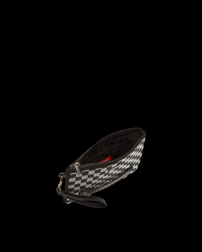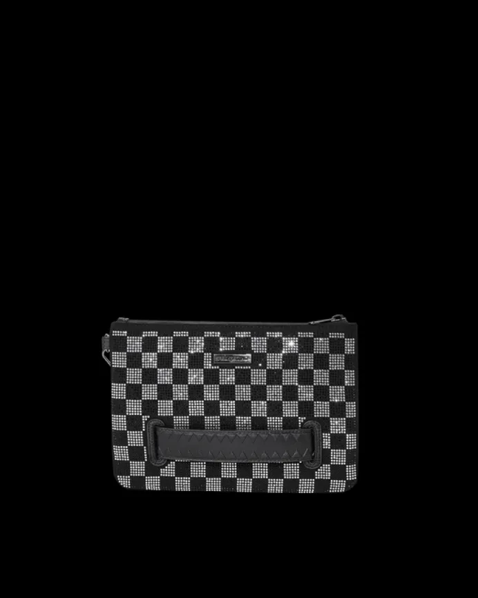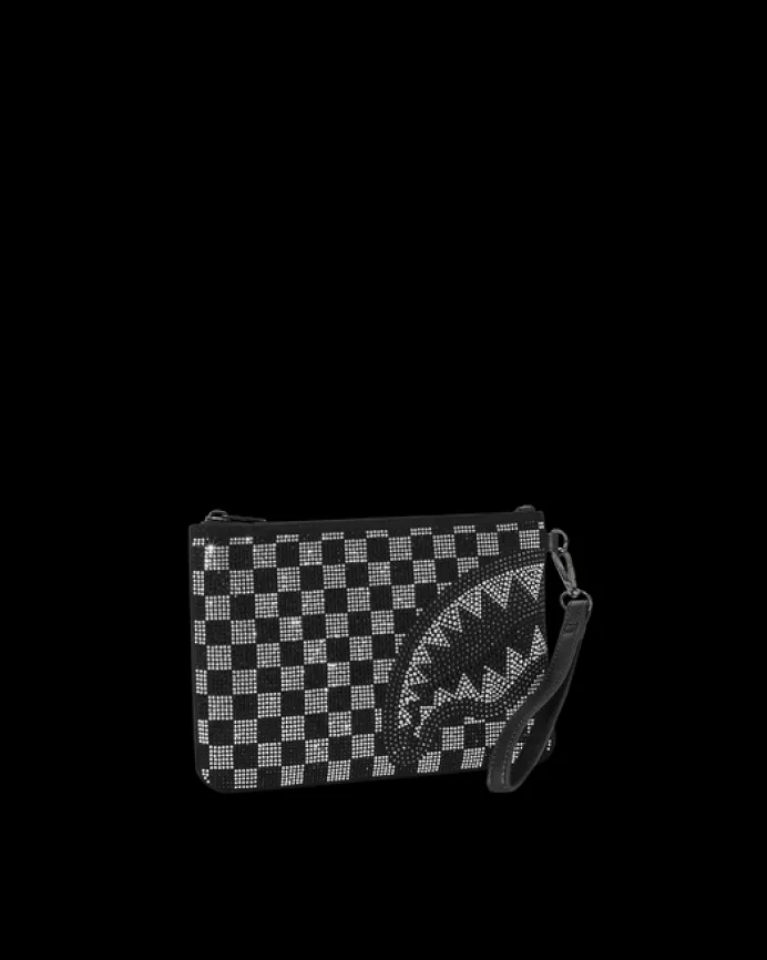 100%FAUXLEATHER CRYSTAL EMBELLISHMENT Convertible Clutch “Pouchette” Pouch with removable wristlet strap, Handle on front panel, Zip Closure, secret stash pocket on side seam1 interior pocket7" X 10" X 0.25"