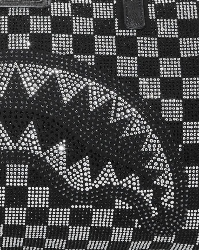 PRODUCT DETAILS 100%FAUX LEATHER CRYSTAL EMBELLISHMENT Dimensions: 8" x 7.5" x 13"• Metal zipper pocket•Back Zippers •Zippered sneaker pocket • gold zippers • Adjustable Straps for custom sizing •Metal Zippers with Metal Hardware • bag of Sprayground money Fabric DurableFaux Leather water-resistant fabric