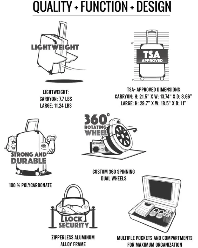 The Journey Begins…Our tough yet lightweight luggage collection is produced with quality, function, and design in mind. The 100% Polycarbonate constructed shell creates superior protection for all your travel goods, while the spacious interior is equipped with multiple pockets and compression straps to keep you