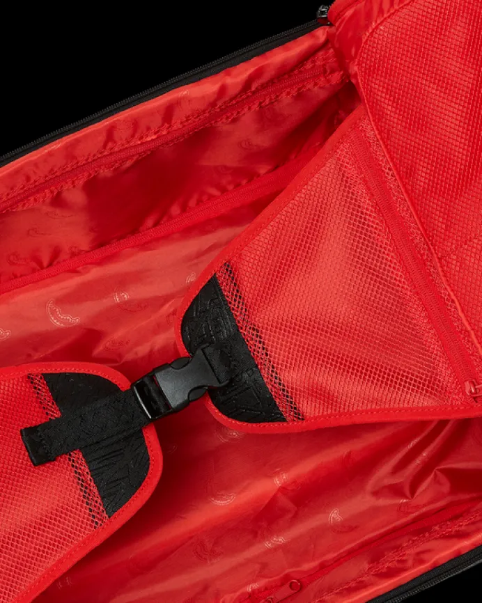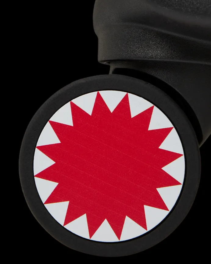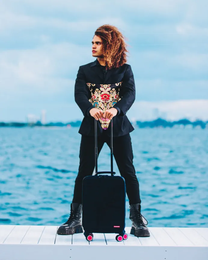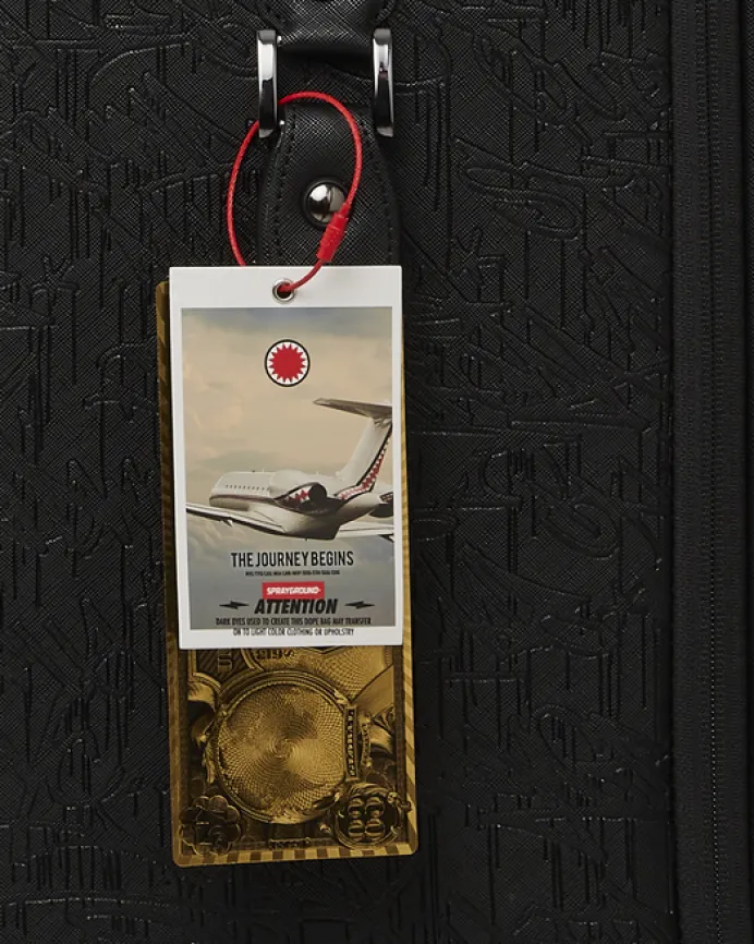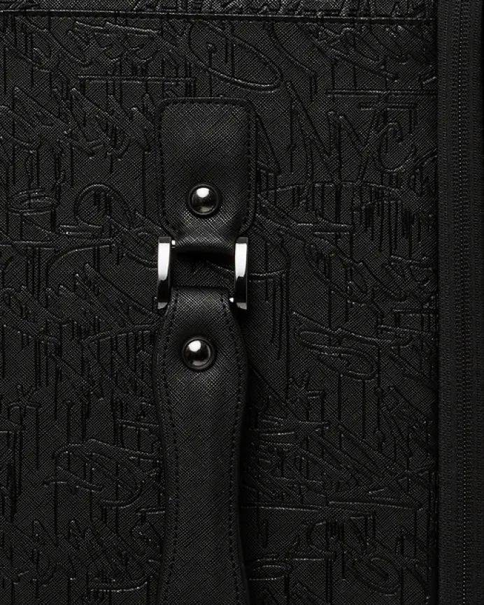 Jet Black Embossed Graffiti Collection EXTERIOR:100 % Polyvinyl Chloride Shell – AKA 100%Faux Leather H: 19.5” x W: 14.5“x D: 7” YKK® Zipper FrameFront Exterior PocketEmbossed LogoFaux leather top & side handles 4 Dual Spinning Recessed WheelsTelescope Adjustable Handle – 2 positions INTERIOR:Multiple Pock