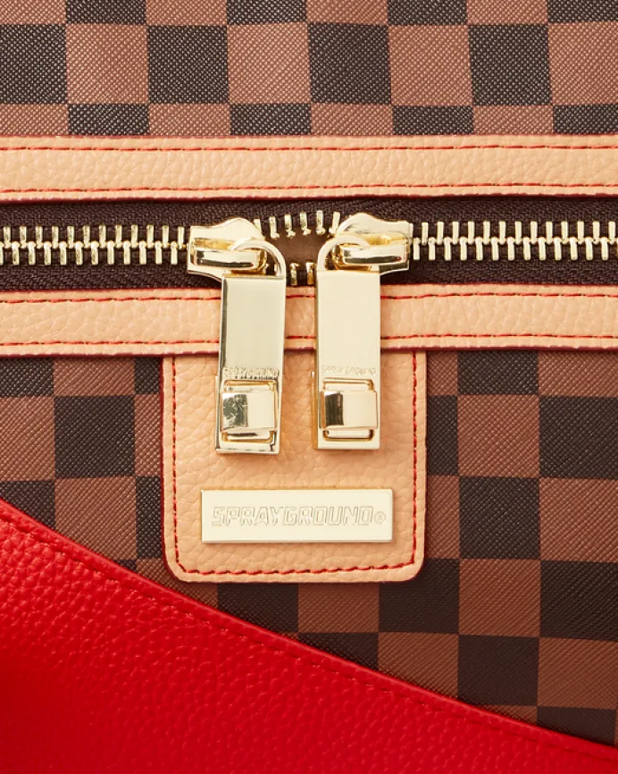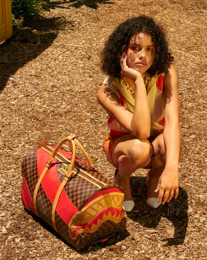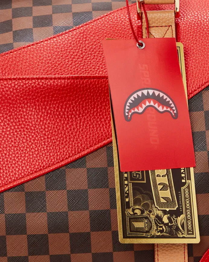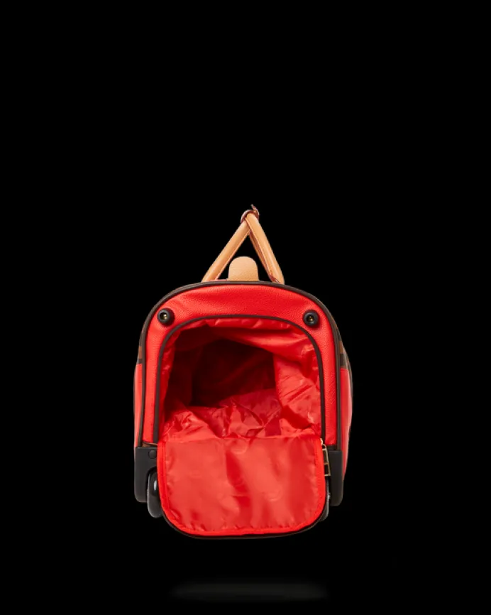 PRODUCT DETAILS 100%FAUX LEATHER Added rolling wheels & handle. Dimensions: 20" x 10" x 10.75" • Metal zipper pocket•Back Zippers •Zippered sneaker pocket • gold zippers • Adjustable Straps for custom sizing •Metal Zippers with Metal Hardware • bag of Sprayground money Fabric DurableFaux Leather water-re