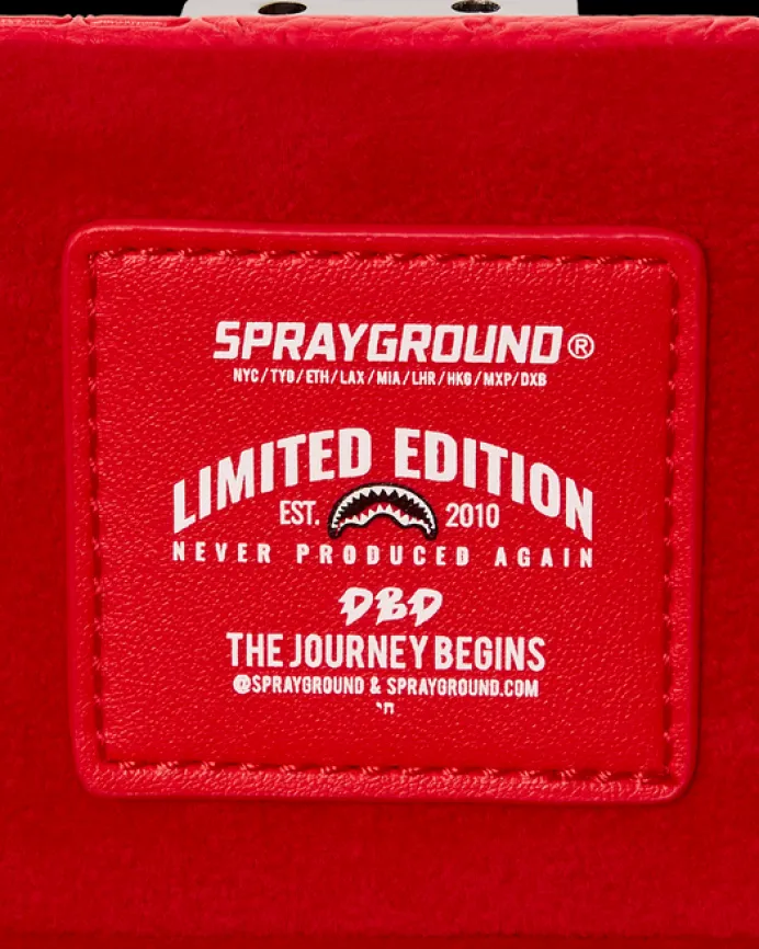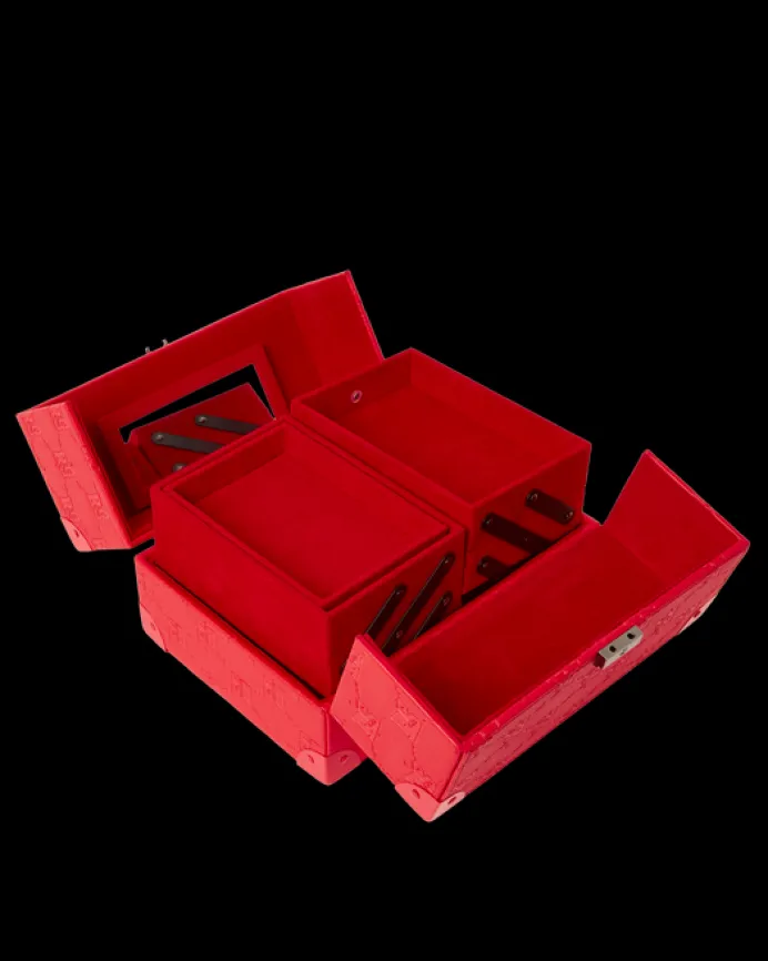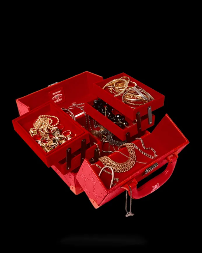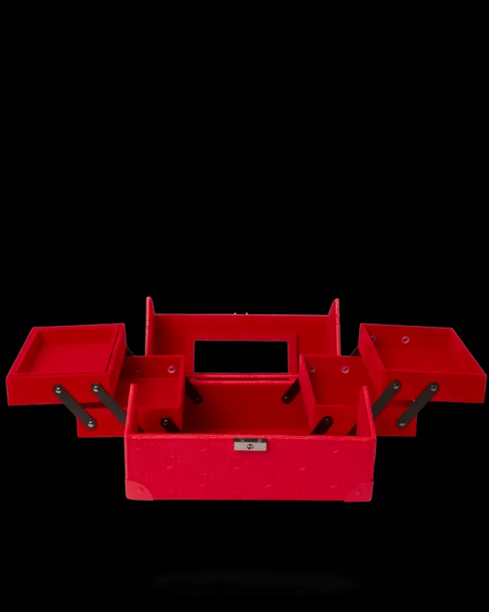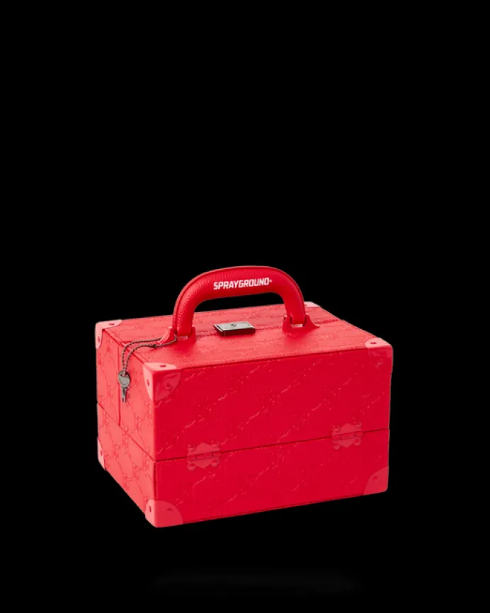 PRODUCT DETAILS: 100% PU – embossed with Sprayground monogram Size: 11" x 7" x 7" Red velour lining, Tiered shelving, removable tray, interior mirror.