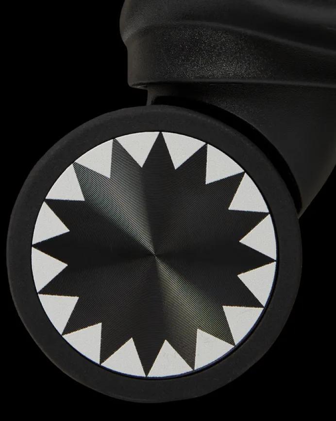 EXTERIOR: 100% Cotton Embellished with Shark Shape cargo pockets, grommet & clips.H: 19.5” x W: 14.5“x D: 7” YKK® Zipper FrameFront Exterior PocketEmbossed LogoFaux leather top & side handles 4 Dual Spinning Recessed WheelsTelescope Adjustable Handle – 2 positions INTERIOR:Multiple Pockets and Compartme