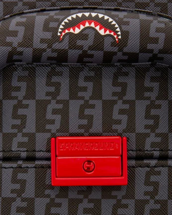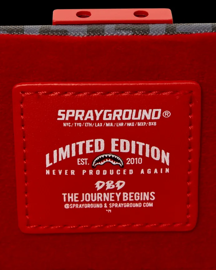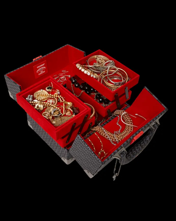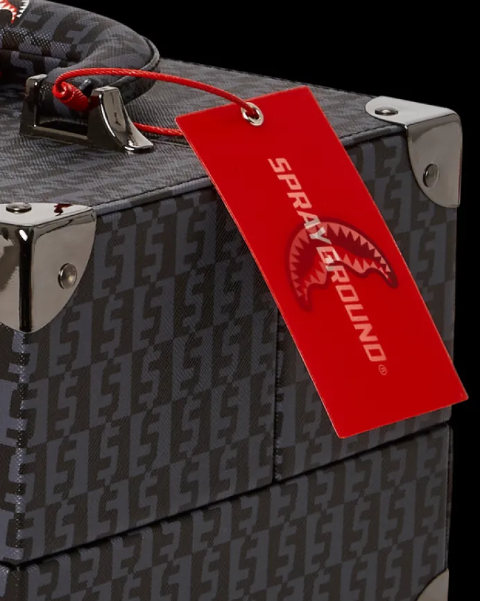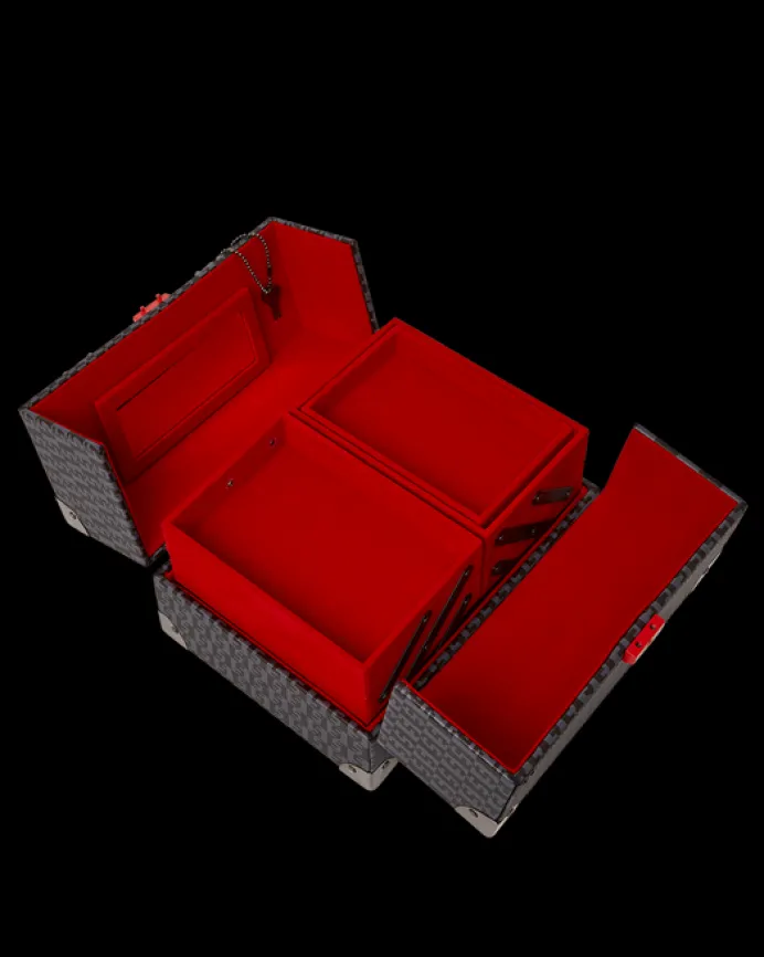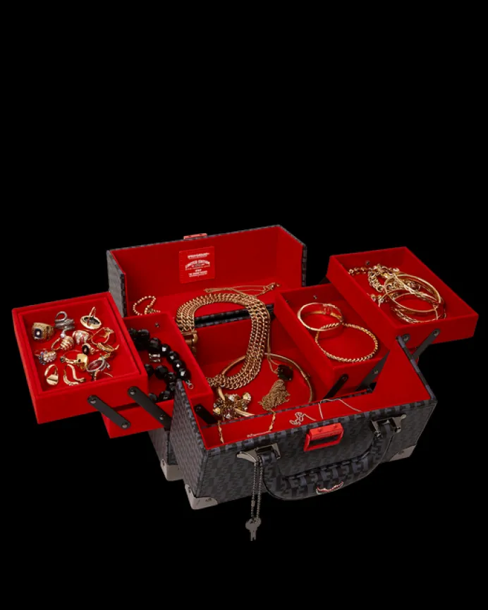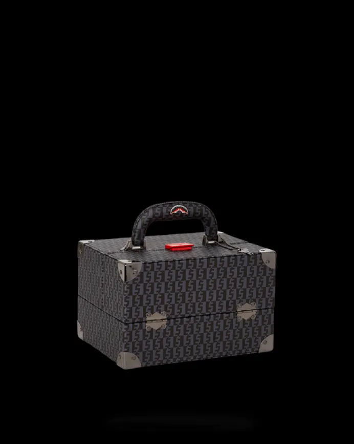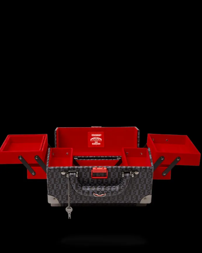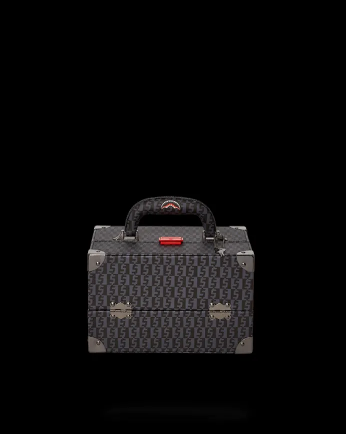 PRODUCT DETAILS: 100% PU – embossed with Sprayground monogram Size: 11" x 7" x 7" Red velour lining, Tiered shelving, removable tray, interior mirror.