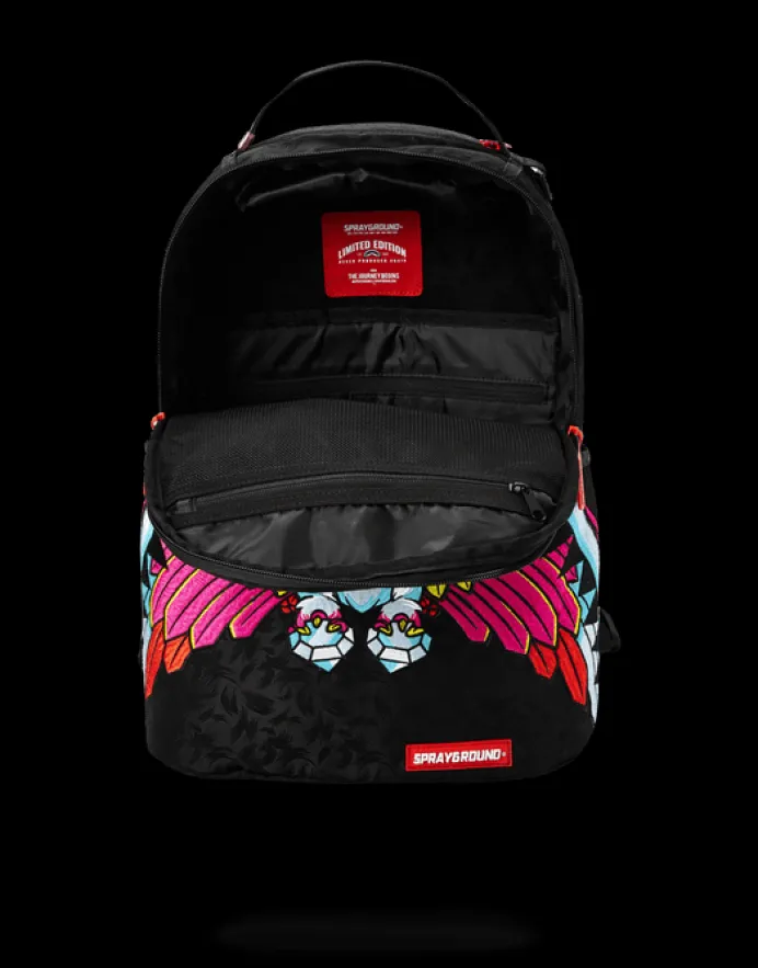 PRODUCT DETAILS Exterior Dimensions: 18" x 6" x 11.5" ∙ Front zipper pocket ∙ Side pockets ∙ Zippered Stash pocket ∙ Ergonomic mesh back padding ∙ Adjustable Straps for custom sizing ∙ Nylon Zippers with Metal Hardware ∙ Metal "Sprayground Authentic" badge ∙ Slide through back sleeve connects to Carry on luggag