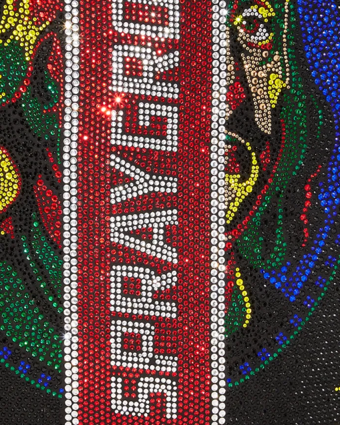 100% Polyester Embellished with vibrant multi color crystals PRODUCT DETAILS Exterior Dimensions: 18" x 6" x 11.5" • Front zipper pocket • Side pockets • Zippered Stash pocket • Separate velour sunglass compartment • Ergonomic mesh back padding • Adjustable Straps for custom sizing • Gold zippers with metal ha