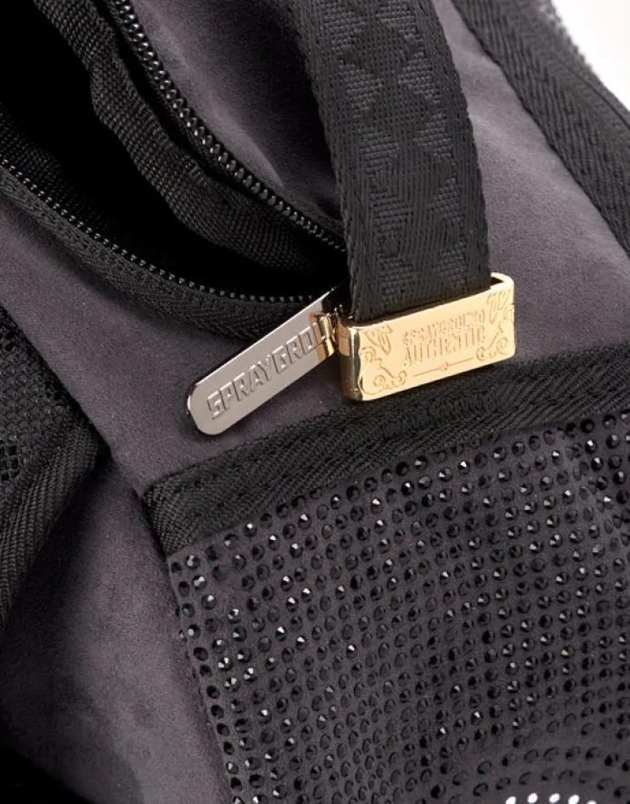 PRODUCT DETAILS Exterior Dimensions: 18" x 6" x 11.5" • Front zipper pocket • Side pockets • Zippered Stash pocket • Separate velour sunglass compartment • Ergonomic mesh back padding • Adjustable Straps for custom sizing • Gunmetal zippers with metal hardware • Metal "Sprayground Authentic" badge • Slide throu